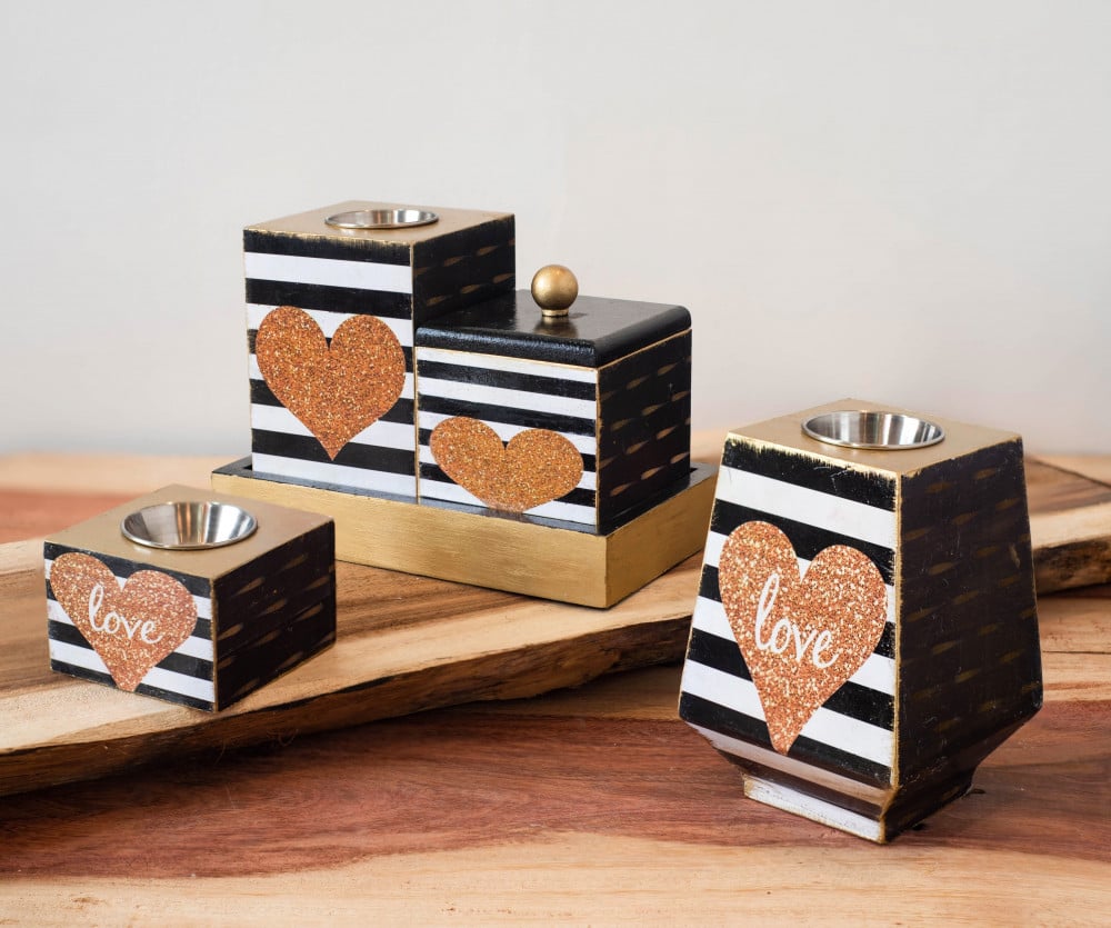 طقم مباخر 5 قطع ديكوباج القلب الذهبي باللون الاسود و الابيض