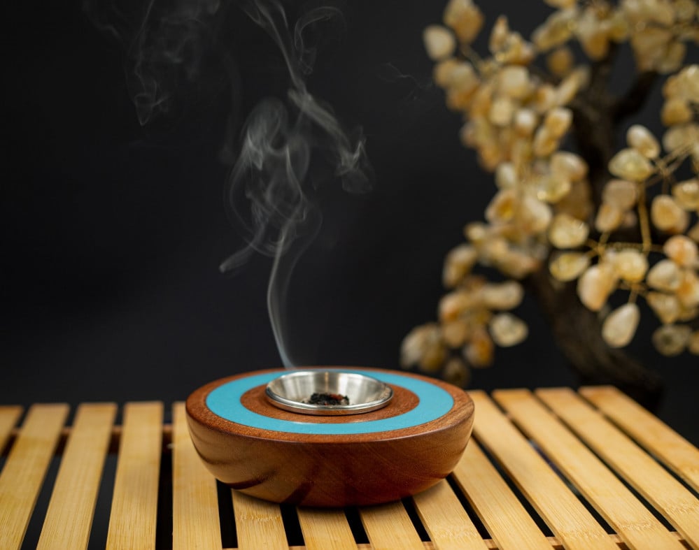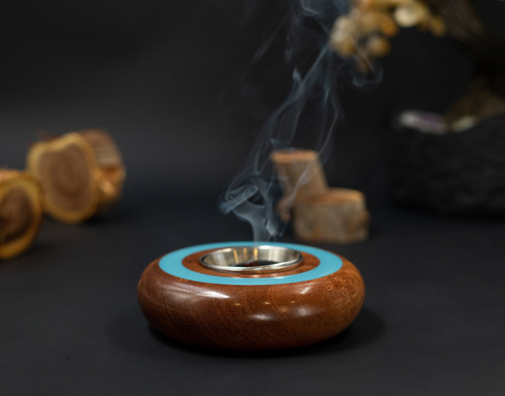 مبخرة من خشب المهاجوني الطبيعي مع الرزن الفيروزي الفاتح تم العمل عليها يدويًا