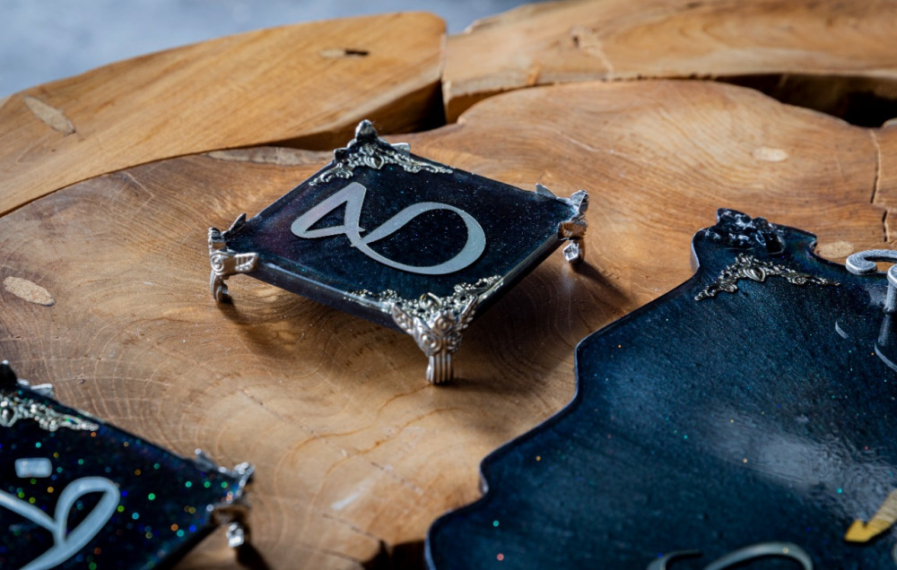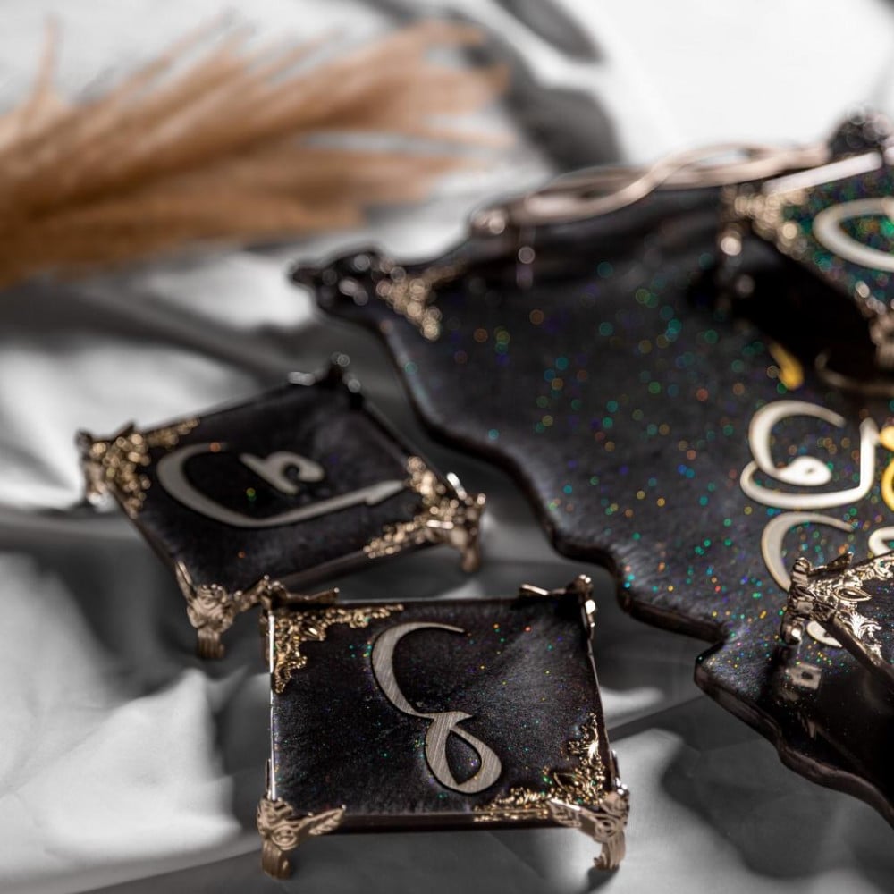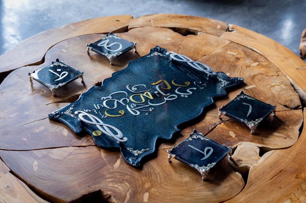 طقم مكون من صينية و4 كوسترات (قاعدات للأكواب) من خامة الرزن والحروفيات