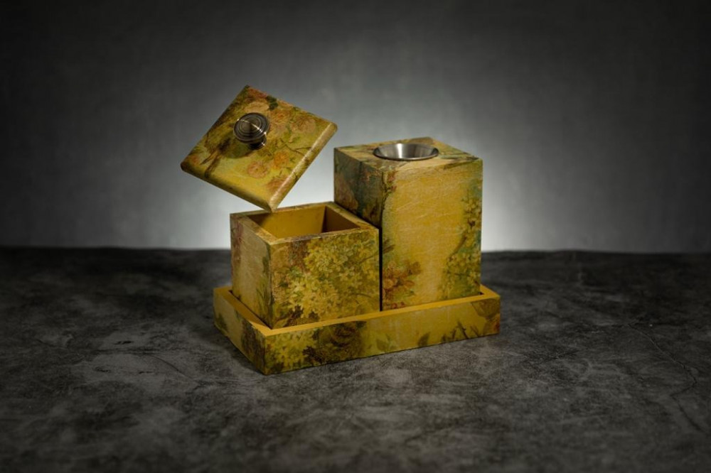 طقم مباخر ديكوباج من مبخرتين صورة ازهار البستان باللون الليمونيعمل الفنانة : فاطمة العوبثانيالمقاس:23سم*13سم*17سم