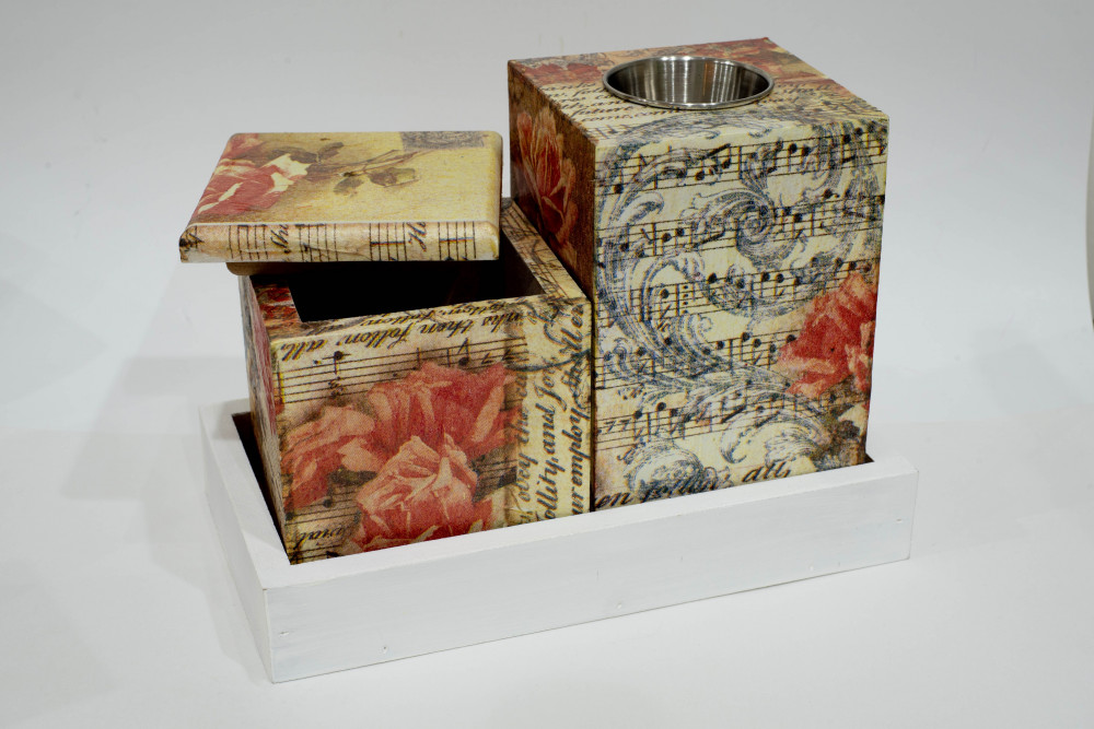 طقم مباخر مع مكان مخصص لحفظ العود أو البخور، مستخدم فيها فن الديكوباج على الخشب، مستلهمه من نوتات الموسيقى الاوروبية، مصنوعة بأنامل فنانين سعوديين