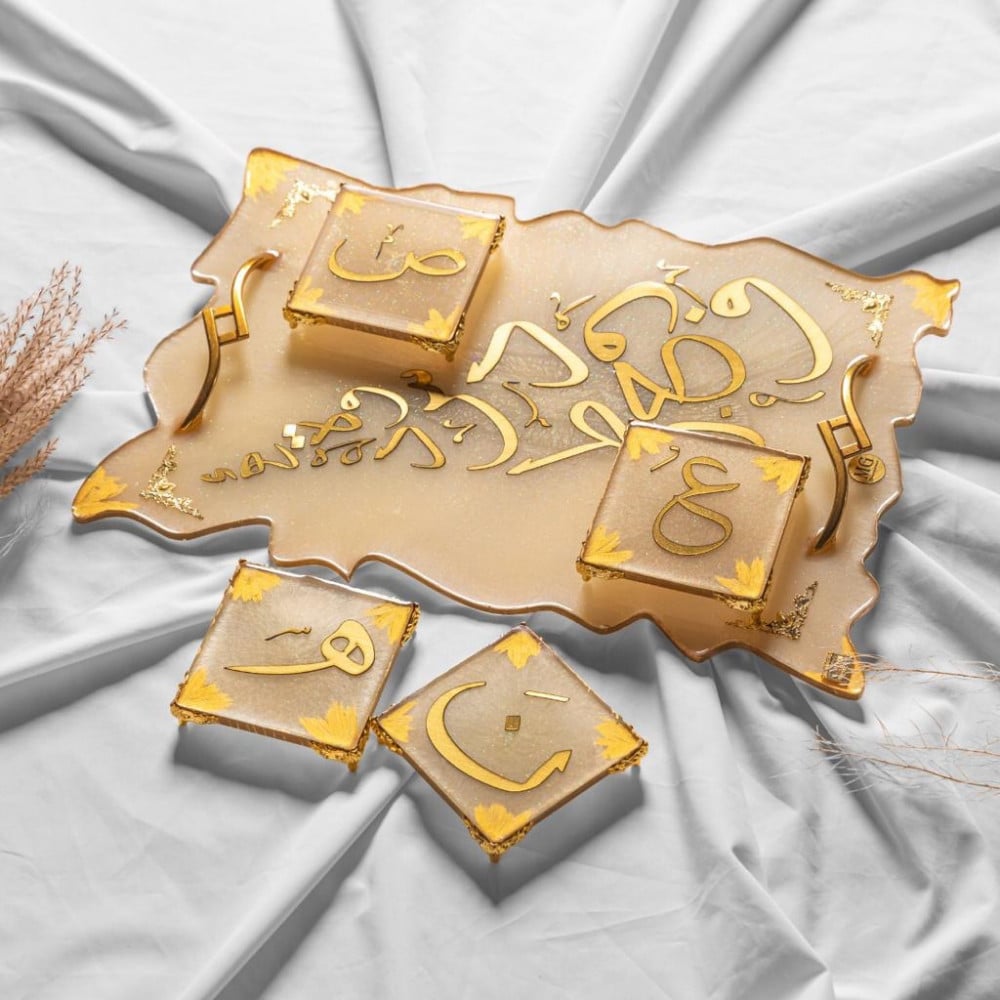 طقم مكون من صينية و4 كوسترات (قاعدات للأكواب) من خامة الرزن والحروفيات.